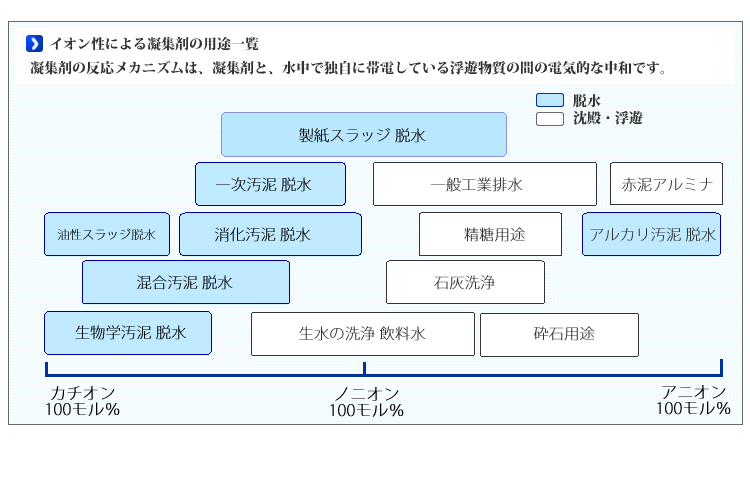 凝集剤は、対象となる物質によって、イオン性がほぼ決まっており、選定の際の参考になります。詳細は、